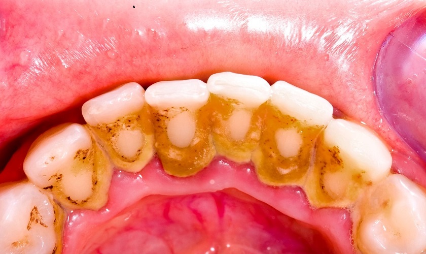 Plaque and tartar buildup: Yellow or brown deposits are visible around the gum line.